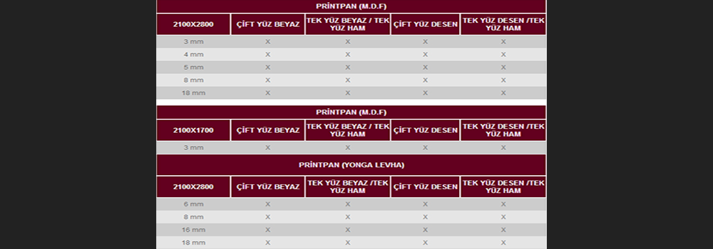 Medepan ve Teknopan levhaların yüzeyinin su bazlı boya ile tek yüz veya çift yüz düz ve ahşap dekorlarla boyanması ile elde edilir.