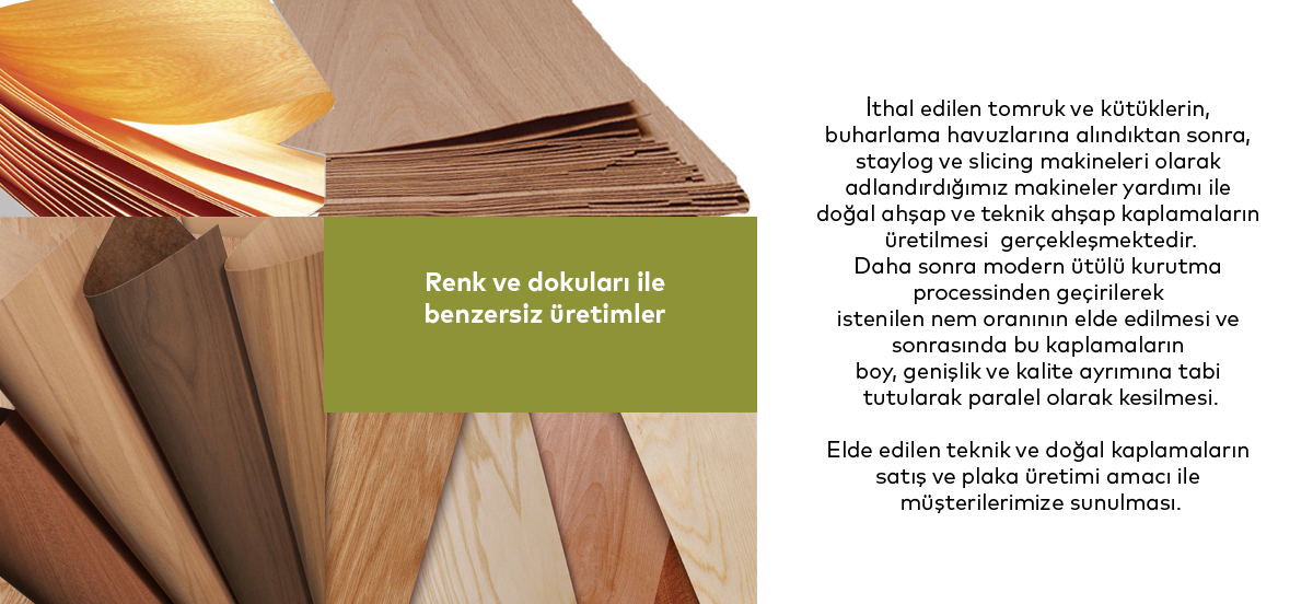 İthal edilen tomruk ve kütüklerin, buharlama havuzlarına alındıktan sonra, staylog ve slicing makineleri olarak adlandırdığımız makineler yardımı ile doğal ahşap ve teknik ahşap kaplamaların